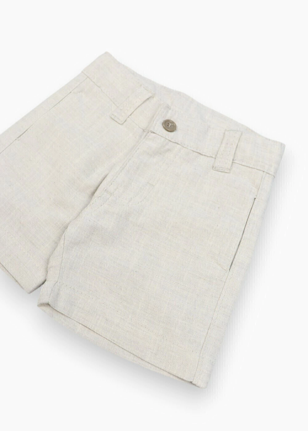 Em tom suave de bege, esse short combina o frescor do linho com a maciez do algodão. Ideal para compor uma roupa social de bebê com leveza e conforto. O corte reto e os bolsinhos ajudam a criar um visual arrumado, perfeito para meninos em momentos especiais, sem perder a naturalidade.