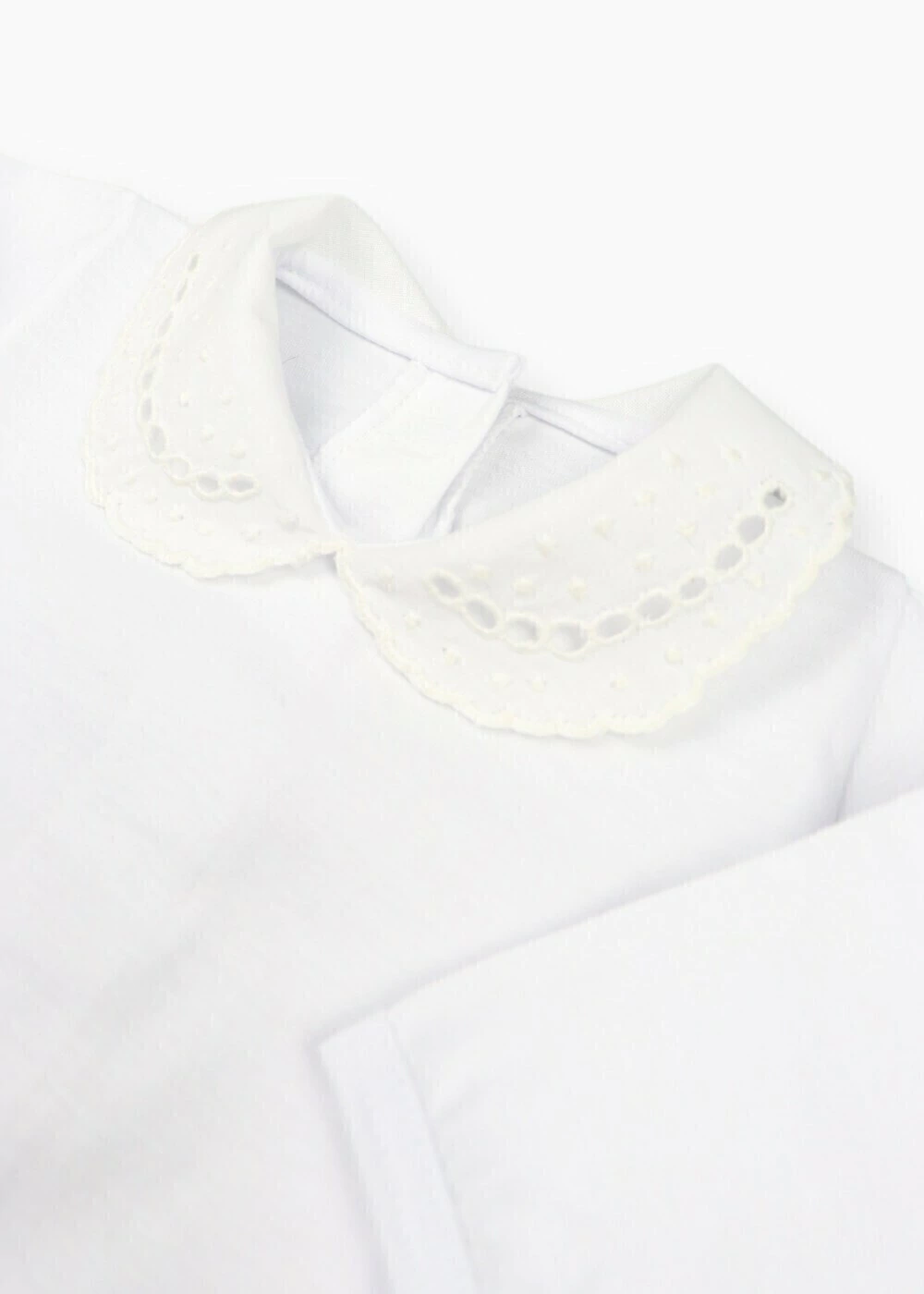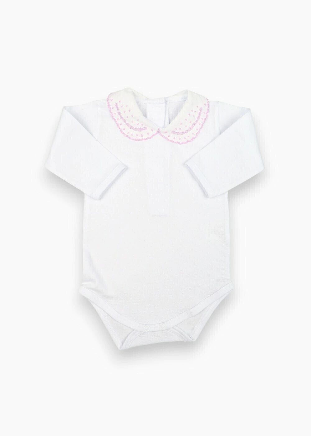 Este body para saída de maternidade é feito em meia malha 100% algodão, macio e confortável para os primeiros dias. A gola em cambraia bordada traz um detalhe delicado e atemporal, que completa o visual com suavidade. Uma peça essencial no enxoval de recém-nascido, perfeita para ser usada por baixo da saída de maternidade.