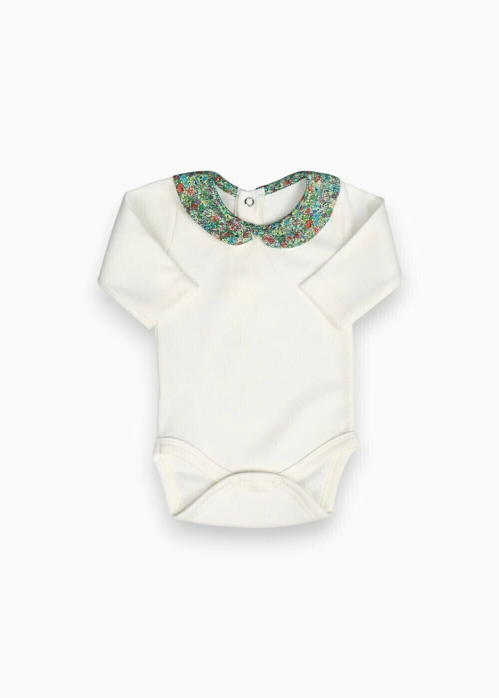 Feito em suedine 100% algodão egípcio, este body foi pensado para vestir recém-nascidos nos primeiros dias. A gola em tecido floral traz um ponto de cor que aparece sutilmente sob a saída de maternidade. Uma peça de enxoval confortável e bem pensada para esse início de vida.