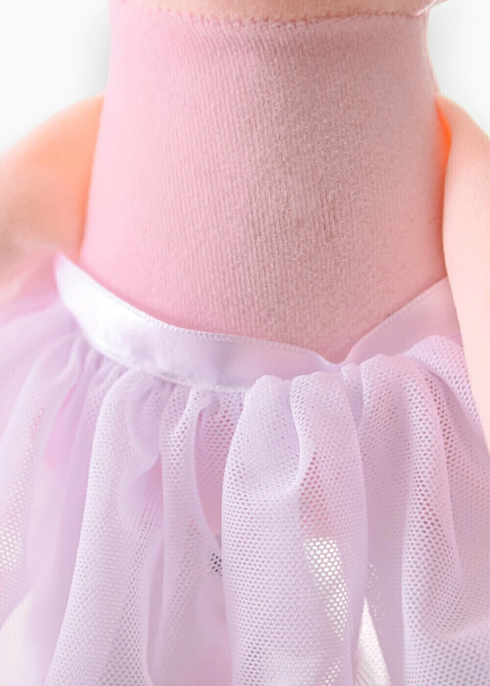 Bia é uma bailarina alegre, com um jeitinho todo delicado. Usa um collant rosa claro com saia de tule e laços nos cabelos, sempre pronta para uma nova apresentação. Suave ao toque e cheia de charme, é daquelas bonequinhas que viram companhia desde cedo — perfeita para embalar brincadeiras, histórias e memórias. Hipoalergênico e lavável.