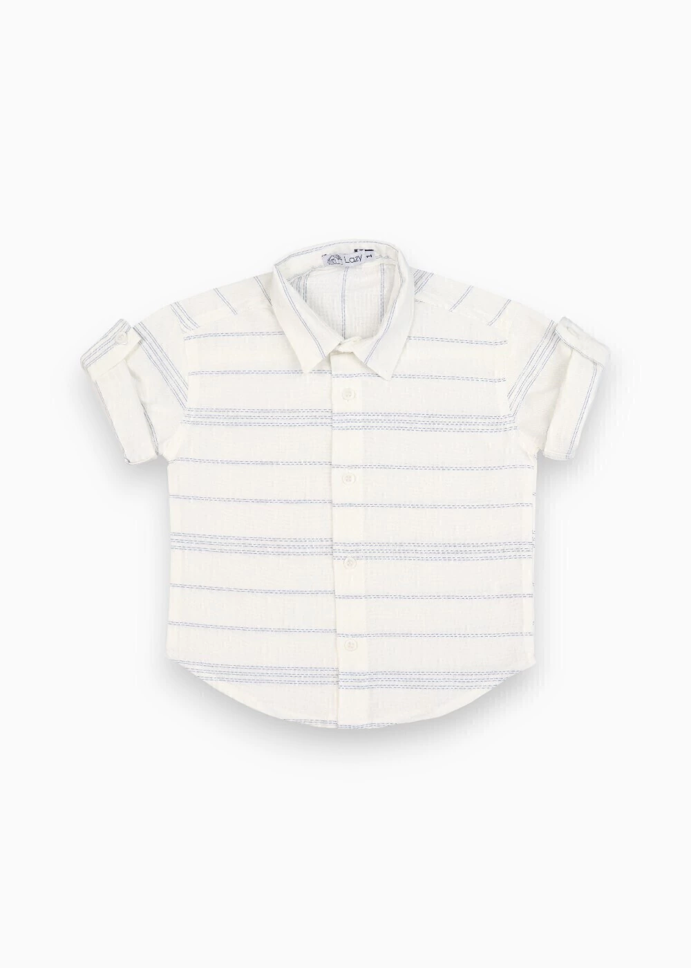 Camisa em tecido 100% algodão com listras azul-claro e fundo cru, de toque leve e caimento estruturado. Gola clássica, abertura frontal e modelagem reta que funciona bem com bermuda ou calça, para compor produções mais arrumadas sem perder conforto.