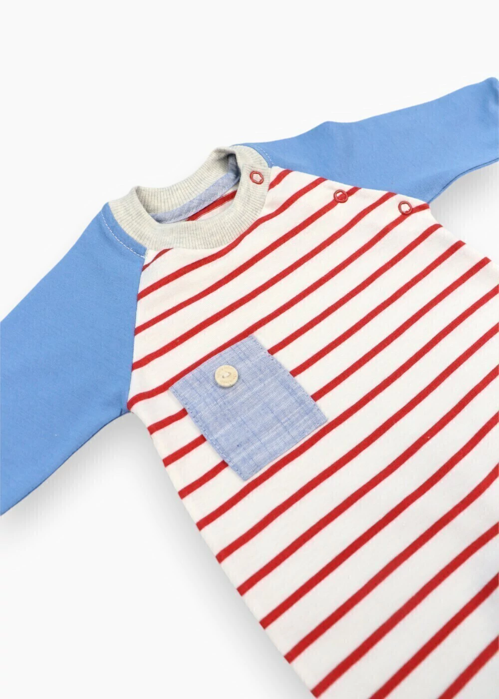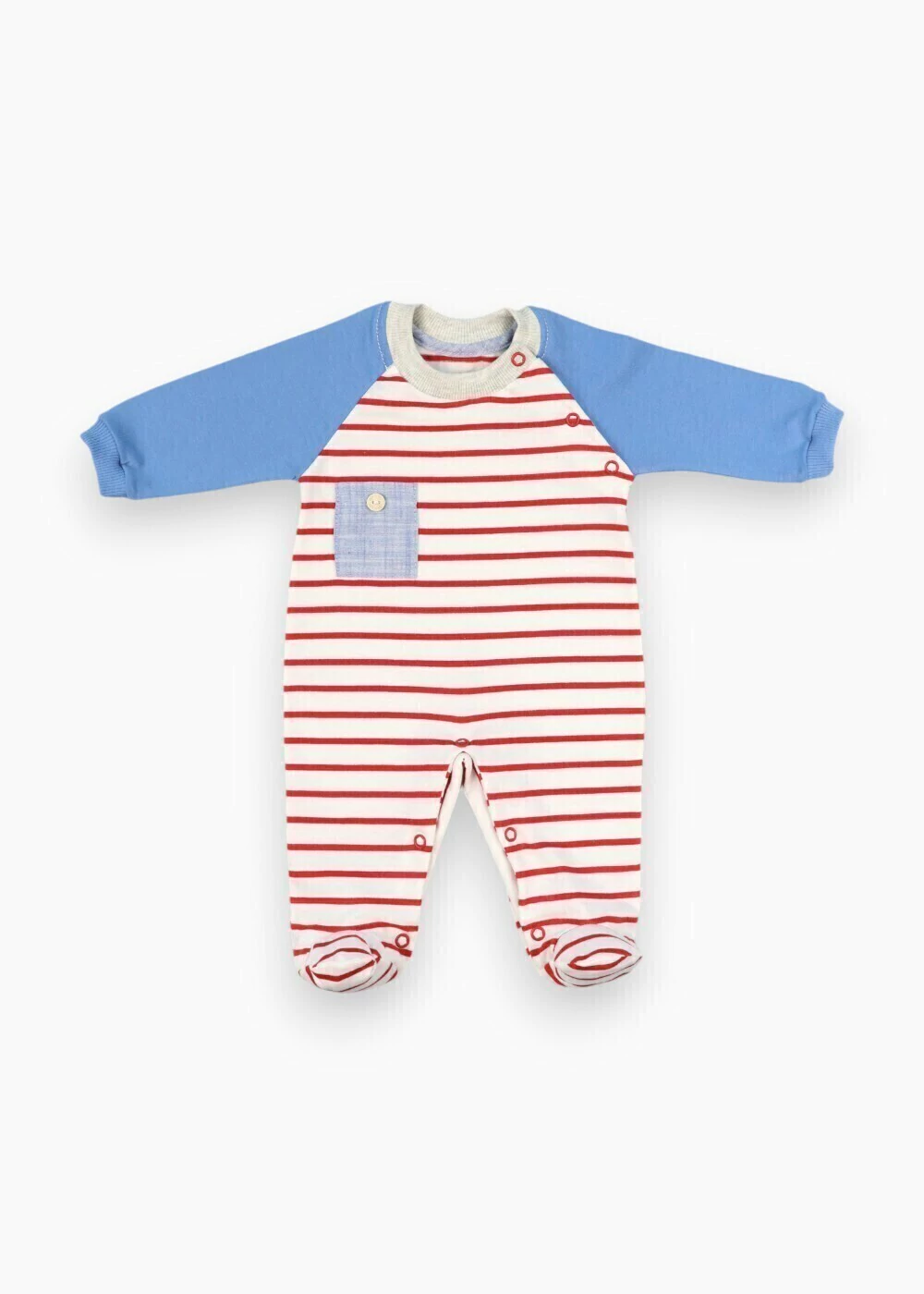 Sabe aquela peça que você veste no bebê e já sente que ele vai ficar confortável o dia inteiro? Esse é o Macacão Bebê Raglan Navy. Feito em meia malha macia, ele tem uma modelagem pensada para deixar seu bebê à vontade, seja nos momentos de brincadeira ou descanso. As mangas raglan em azul, junto com as listras vermelhas, dão um toque moderno e delicado. E, claro, o pequeno bolso frontal é aquele detalhe que faz diferença. Com abotoamento no entrepernas, fica fácil de vestir e trocar sem complicações.