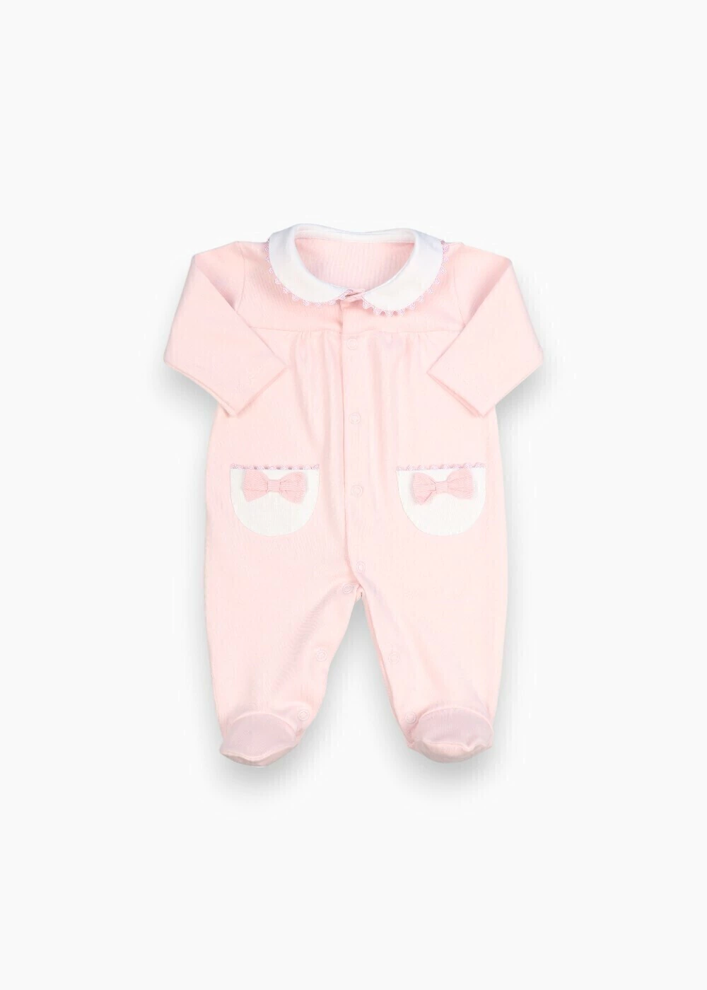 Macacão em suedine de algodão egípcio, com toque macio e confortável. A gola boneca em xadrez vichy rosa e os bolsos com laços em chambray trazem um charme delicado. Abertura frontal facilita o vestir, e o punho com detalhe franzido completa a peça. Uma opção graciosa para ocasiões especiais ou para ser usado como saída de maternidade.