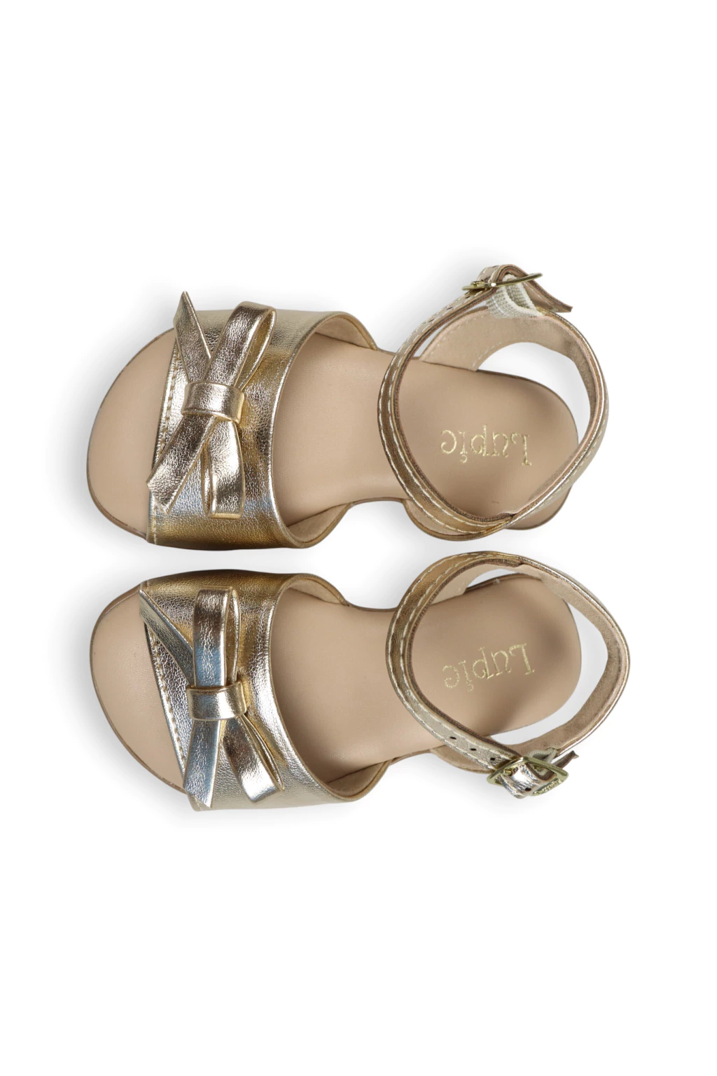 • Características: Sandália dourada para bebê em couro legítimo, com laço frontal, fechamento com fivela e acabamento metalizado.