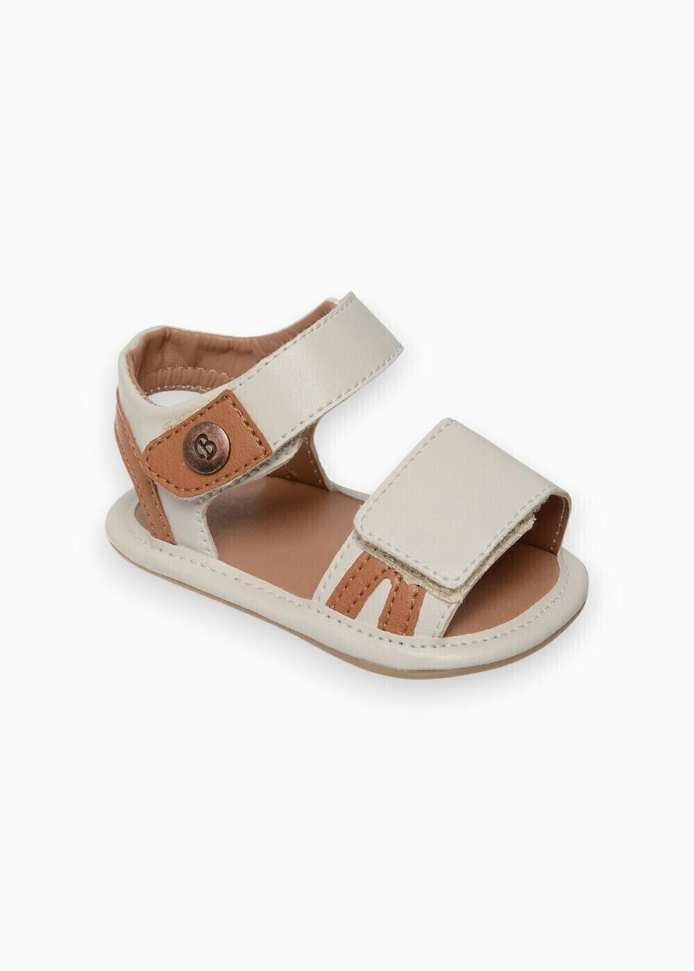 Essa sandália de bebê para menino traz combinação de tons claros e caramelo, com acabamento fosco e textura suave. O fecho em velcro facilita o ajuste e o botão lateral adiciona um toque discreto. Ideal para produções leves e confortáveis, com peças em algodão ou linho.