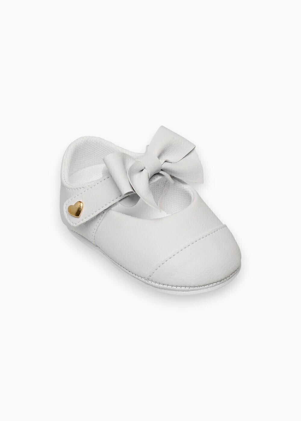 • Características: Sapatinho de bebê com laço central, acabamento fosco na cor branca e fechamento com velcro reforçado. Detalhe dourado em formato de coração na lateral.