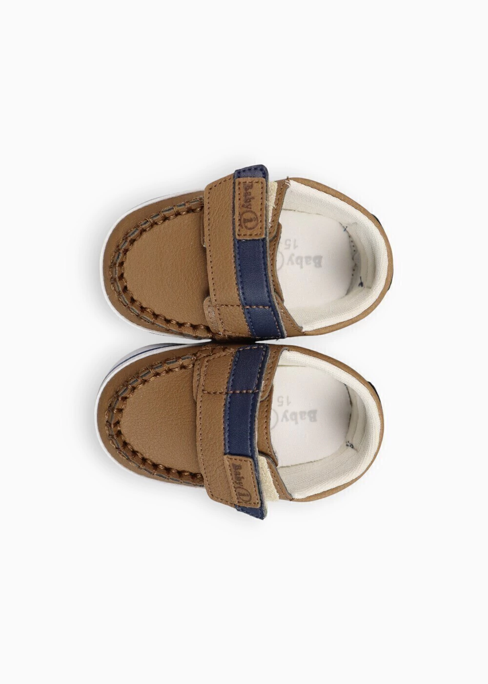 Esse sapatinho estilo mocassim é uma escolha charmosa e confortável para os primeiros passeios. Com acabamento caramelo, detalhe azul marinho e costura aparente, é fácil de calçar e combina com diversos looks de bebê menino - do mais casual ao mais arrumado.