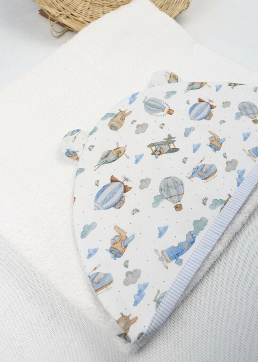 A toalha de bebê com capuz é sinônimo de conforto e proteção. Feita com uma camada dupla de atoalhado e tecido fralda, seca suavemente a pele e os cabelos delicados do bebê. O capuz estampado em formato de ursinho é um detalhe que, além de charmoso, aquece e protege a cabeça após o banho. Pensada para os primeiros meses de vida, é perfeita para tornar o pós-banho mais aconchegante e prático.