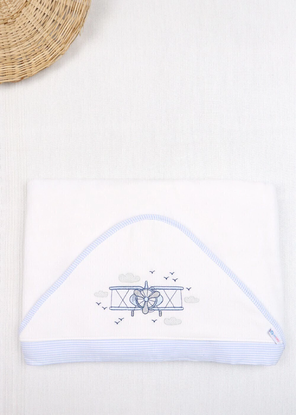 Toalha com capuz 100% algodão, com camada felpuda e forro de fralda dupla que protege a pele sensível do bebê. Mede 90x65 cm, sendo ideal para a hora do banho. O bordado no capuz traz um detalhe delicado ao enxoval.