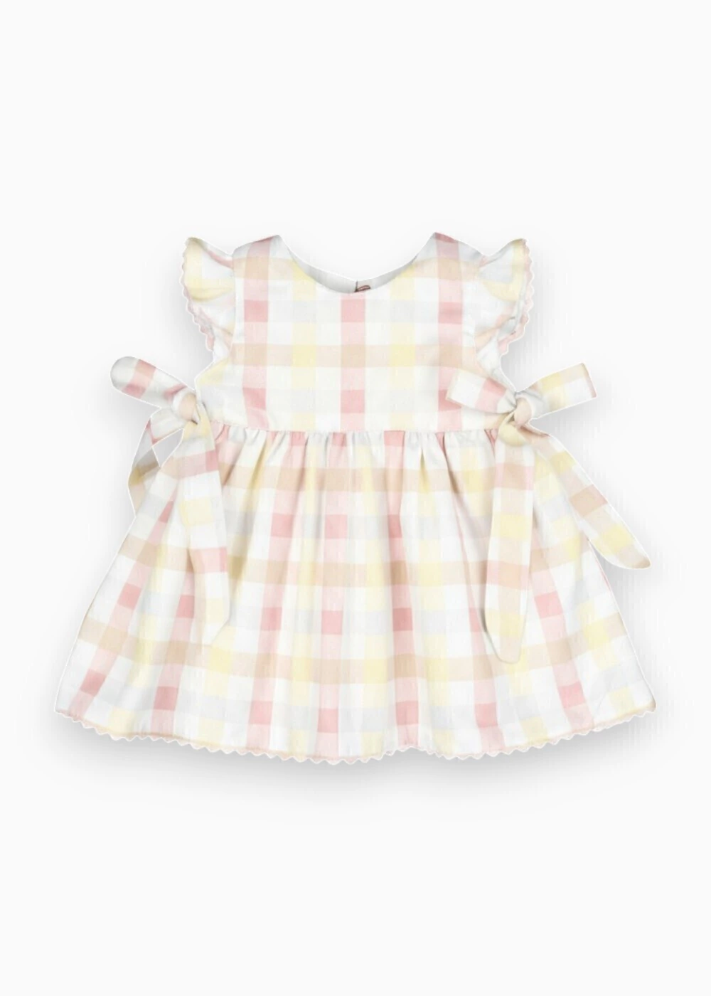Vestido bebê em tecido xadrez nos tons de rosa, amarelo e branco, com laços laterais que realçam o charme da peça. As mangas de babadinhos completam o visual delicado, enquanto o corte soltinho traz conforto. Um modelo romântico e versátil, ideal para acompanhar a infância em momentos de alegria e descobertas.