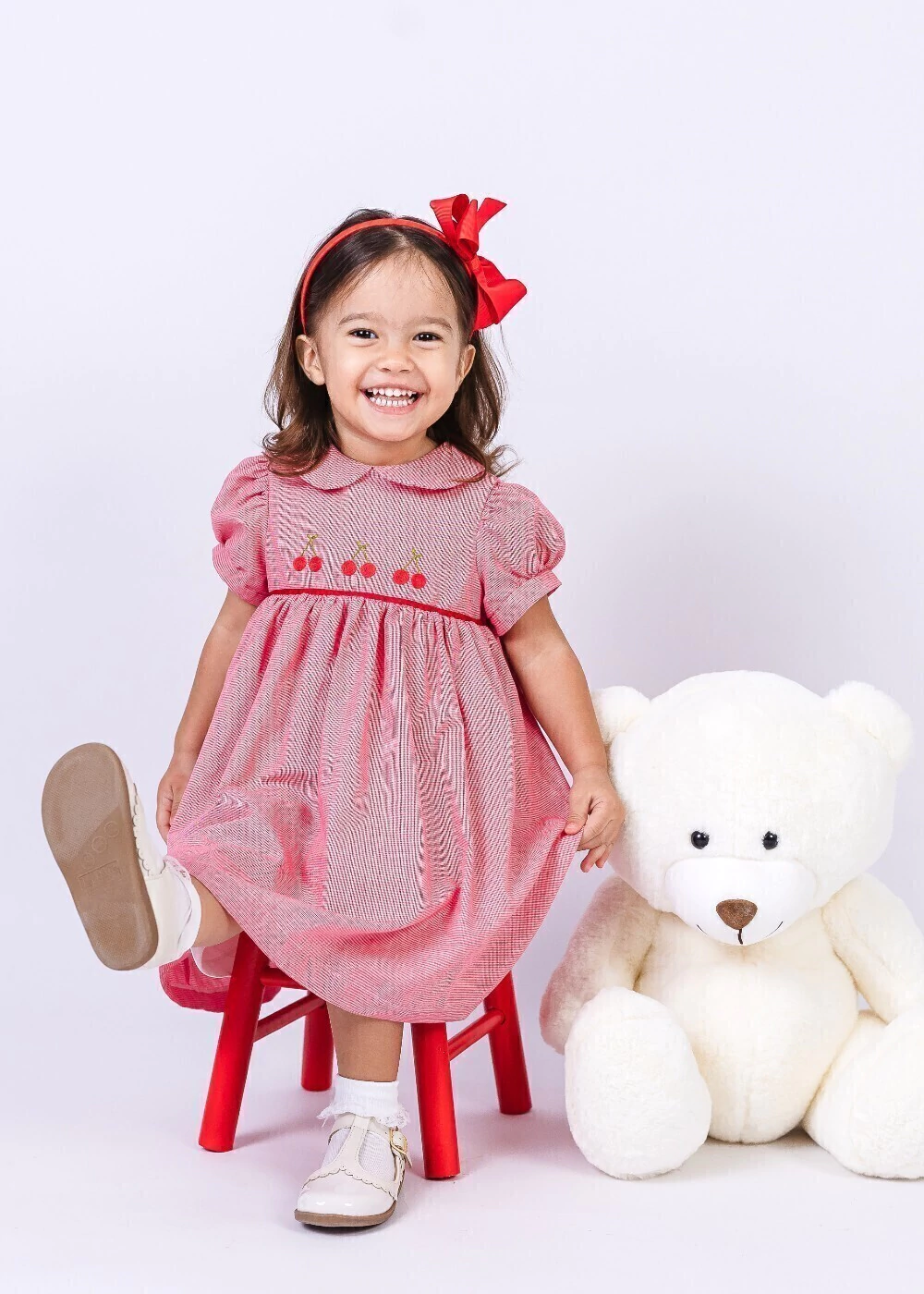 • Características: Vestido infantil com bordado artesanal de cerejinhas, tecido 100% algodão, mangas bufantes, gola e forro. Ideal para o Natal e ocasiões especiais.