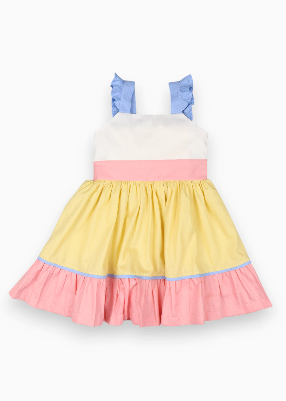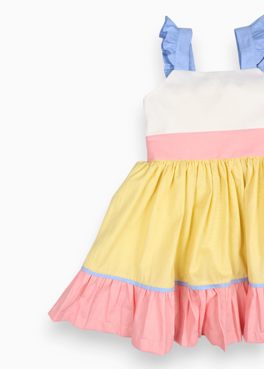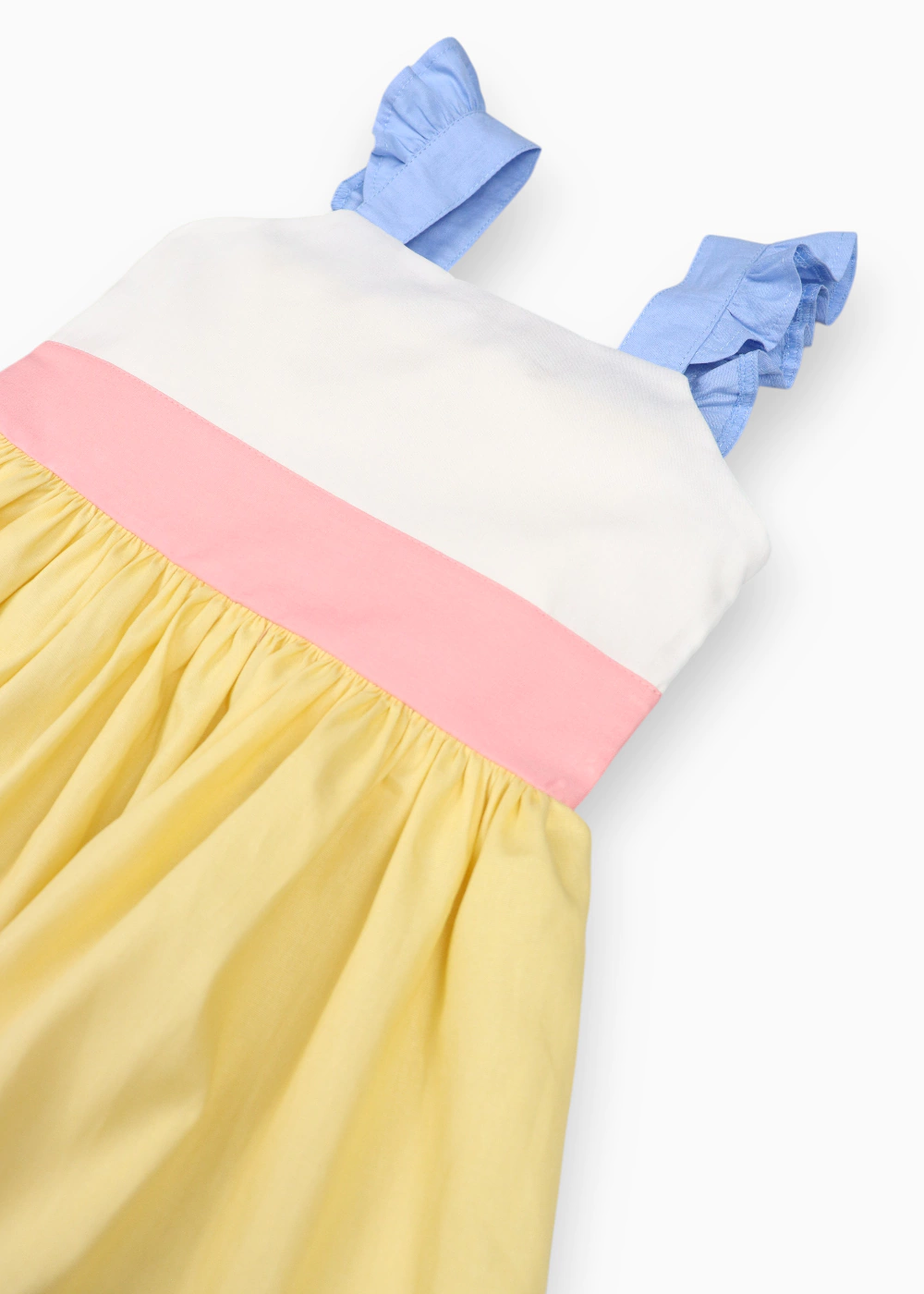 Com recorte leve e tons que se misturam como aquarela, este vestido infantil colorido traz um ar solar e descontraído. O lastex nas costas garante conforto em todos os momentos, enquanto as alças em azul estruturado dão charme à peça. Ideal para dias quentes, é uma escolha leve e cheia de movimento na rotina da infância.